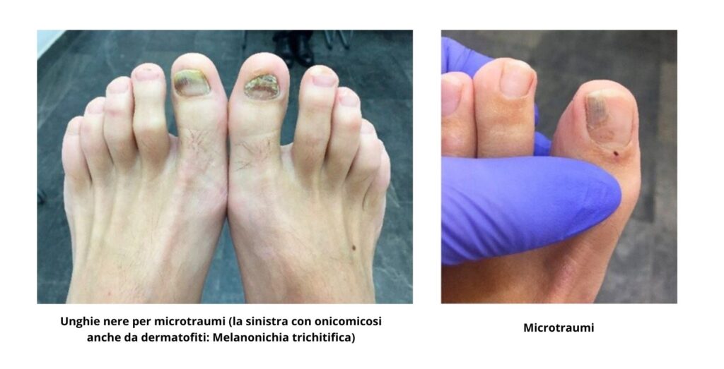- Infezioni fungine: alcuni funghi possono causare accumuli di detriti scuri sotto l’unghia.